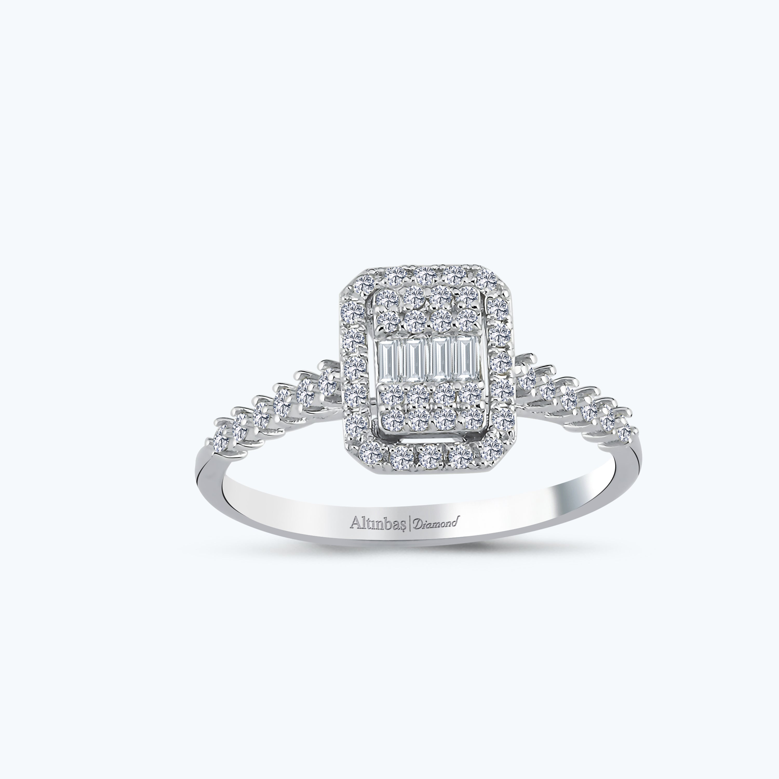 Introducing the Baguette Diamond Ring from Altınbaş Jewellery - a perfect embodiment of sophistication and quality. This stunning piece is crafted from 14K white gold, renowned for its durability and timeless appeal. The ring is beautifully designed, embracing the power of simplicity and elegance, making it an ideal choice for the discerning woman. The centrepiece of this exquisite ring is the baguette diamond, a unique cut that reflects light in a distinct way. This diamond cut is known for its elongated, rectangular shape that offers a level of clarity and brilliance that is simply unmatched. It is surrounded by a halo of smaller diamonds, enhancing its sparkle and creating a mesmerising effect. This ring is more than just a piece of jewellery; it's a symbol of the moment when two hearts unite. It's an expression of sophistication, a testament to the bond shared between two people. The baguette diamond, with its clear, straight lines, mirrors the strength and clarity of this bond. The white gold setting of the ring not only complements the dazzling diamonds but also emanates the energy of the sun. This combination of gold and diamond creates a radiant piece that shines with a light of its own, reflecting the love and warmth of the relationship it represents. The Baguette Diamond Ring is a perfect engagement ring, a promise of love and commitment. It's a ring that speaks volumes, a ring that says, "You are cherished, you are loved". This is more than a ring; it's a symbol of a beautiful journey that two people decide to embark on together. Altınbaş Jewellery, with its commitment to quality and sophistication, ensures that this ring is not just a piece of jewellery, but a treasure to be cherished for a lifetime. A testament to the beauty of simplicity, this ring is a perfect choice for the woman who values elegance and sophistication.