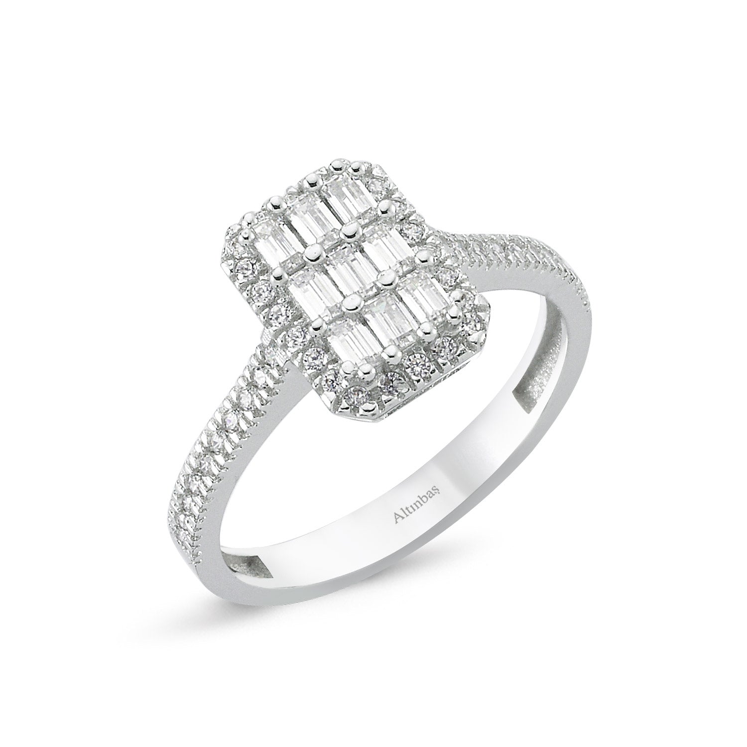 Introducing the Baguette Gold Ring from Altınbaş Jewellery, the epitome of refined taste and timeless elegance. This exquisite piece is not just a ring, but a symbol of the magical moment when two hearts unite. Crafted with the utmost precision, it embodies sophistication and quality in every detail, making it a perfect choice for the discerning woman. This stunning ring is meticulously crafted from 14K white gold, a metal known for its durability and timeless appeal. The white gold acts as the perfect canvas for the sparkling cubic zirconia stones, enhancing their brilliance and creating a mesmerising spectacle. The baguette cut of the cubic zirconia stones adds an additional layer of sophistication to this ring. This unique cut, with its long, rectangular facets, maximises the stone's clarity and amplifies its sparkle, making it a true statement piece. The ring is not just about beauty, it's about quality too. At Altınbaş, we take pride in our craftsmanship and ensure that each piece we create is of the highest quality. This ring is no exception. Its sturdy construction ensures it will withstand the test of time, just like your love. This Baguette Gold Ring is more than just an engagement ring; it's a testament to your love story. Its timeless elegance and sophistication make it a perfect symbol of your eternal bond. It's not just a piece of jewellery, but a piece of art that depicts the union of two hearts. Whether you're planning a proposal, celebrating an anniversary, or simply want to express your love, this ring is the perfect choice. It's a piece that will be treasured for a lifetime, a constant reminder of the special bond you share. So why wait? Let this Baguette Gold Ring from Altınbaş Jewellery be the symbol of your love and commitment. It's more than a ring; it's a promise of a lifetime.