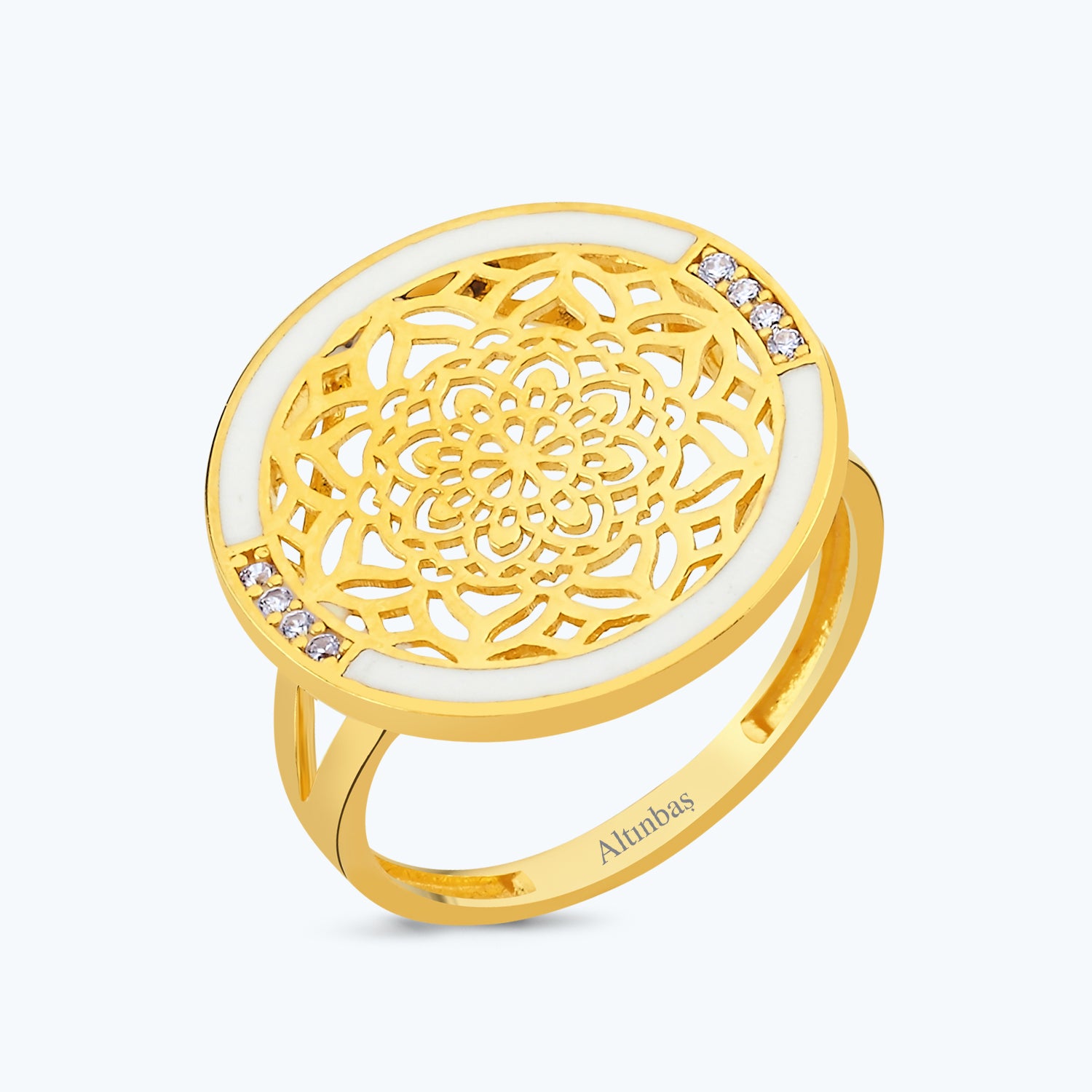 Introducing the 22K Mandala Gold Ring from Altınbaş Jewellery, a piece that is a symbol of eternal round of radiant beauty. This exquisite piece is more than just a piece of jewellery; it's a testament to the timeless allure of gold and the enduring appeal of sophisticated design. Crafted from 22K yellow gold, this ring is a perfect blend of traditional craftsmanship and modern aesthetics. The gold is of high purity, ensuring a rich, warm glow that lasts. It's a piece that truly embodies sophistication and charm, making it a must-have for any woman's jewellery collection. The ring is adorned with a mandala design, a symbol of unity and harmony. This intricate pattern is meticulously etched into the gold, creating a captivating visual effect. Each curve and line of the mandala is a testament to the exceptional skill of our artisans. Adding to the ring's allure are the round cubic zirconia stones. These stones are carefully selected for their brilliant sparkle and clarity, enhancing the overall beauty of the ring. Their placement within the mandala design creates a mesmerising play of light, making the ring a standout piece. The 22K Mandala Gold Ring is not just a piece of jewellery, but a piece of art. Its timeless design and superior craftsmanship make it a suitable choice for both daily wear and special occasions. This ring is a perfect gift for the woman who appreciates elegance and sophistication, making it a piece that will be cherished for a lifetime. Experience the eternal round of radiant beauty with Altınbaş Jewellery's 22K Mandala Gold Ring. It's more than just a ring - it's a statement of your unique style and refined taste.