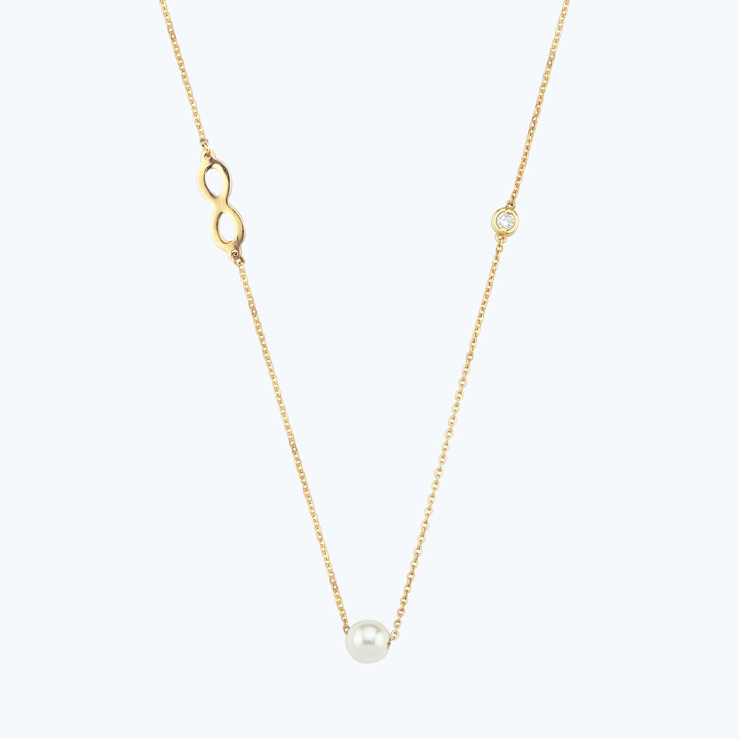With a dainty design, the Altınbaş Jewellery Infinity Pearl Diamond Necklace is carefully handcrafted from 14ct Solid Gold with the most sparkling pure diamond selected and carefully set by experienced craftsmen.