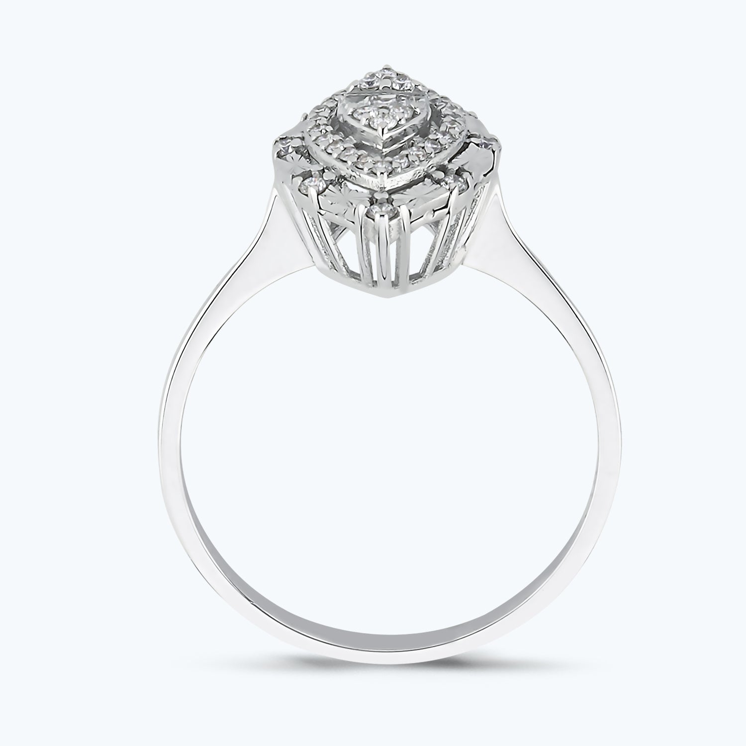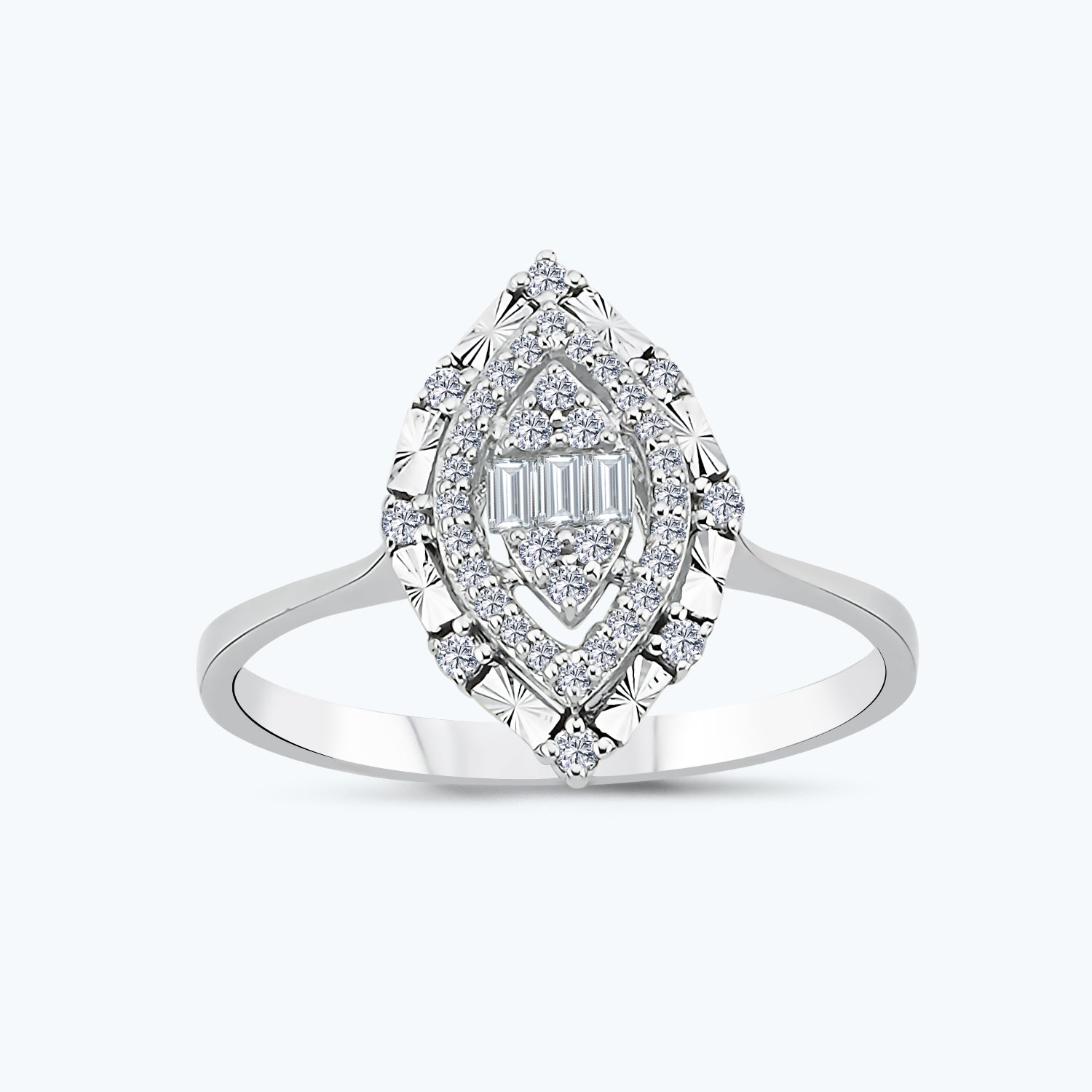 Introducing the Baguette Diamond Ring from Altınbaş Jewellery, a true embodiment of timeless elegance. This stunning piece is meticulously crafted from 14K white gold, a precious metal that represents the perfect balance of luxury and durability. The gleaming white gold band serves as the perfect backdrop for the dazzling round and baguette diamonds, each handpicked for their exceptional brilliance and clarity. This ring is not just a piece of jewellery; it is a manifestation of wealth and prestige, a symbol of the eternal bond of love. When you slip this ring onto your finger, you're not just wearing a piece of jewellery, you're wearing a promise of forever. The design of the ring is inspired by the concept of the union of hearts. The main diamond is encircled by a halo of smaller diamonds, a design that symbolises two hearts becoming one. This design is not only visually appealing but also carries a deep, romantic significance. The Baguette Diamond Ring exudes class and charm, making it an ideal choice for an engagement ring. The combination of round and baguette diamonds creates a unique play of light, capturing the attention and admiration of everyone in the room. Altınbaş Jewellery is renowned for its commitment to quality and sophistication. Each piece is a testament to our master craftsmen's skill and passion, ensuring that you are investing in a piece of jewellery that will last a lifetime. This ring is designed for women who appreciate the finer things in life. It is a statement piece that adds a touch of luxury to any outfit, making it perfect for special occasions or everyday wear. Invest in the Baguette Diamond Ring from Altınbaş Jewellery and experience the joy of owning a piece of jewellery that is as unique and beautiful as your love story.