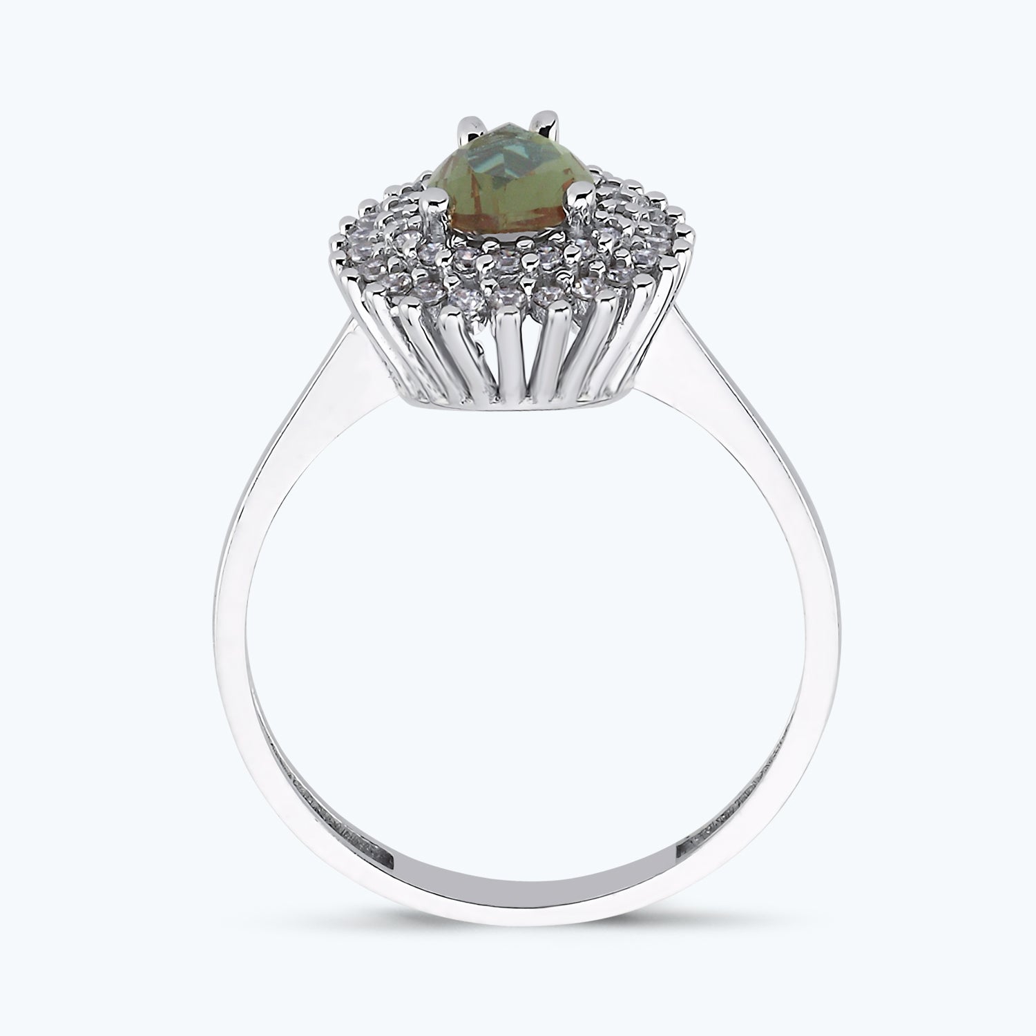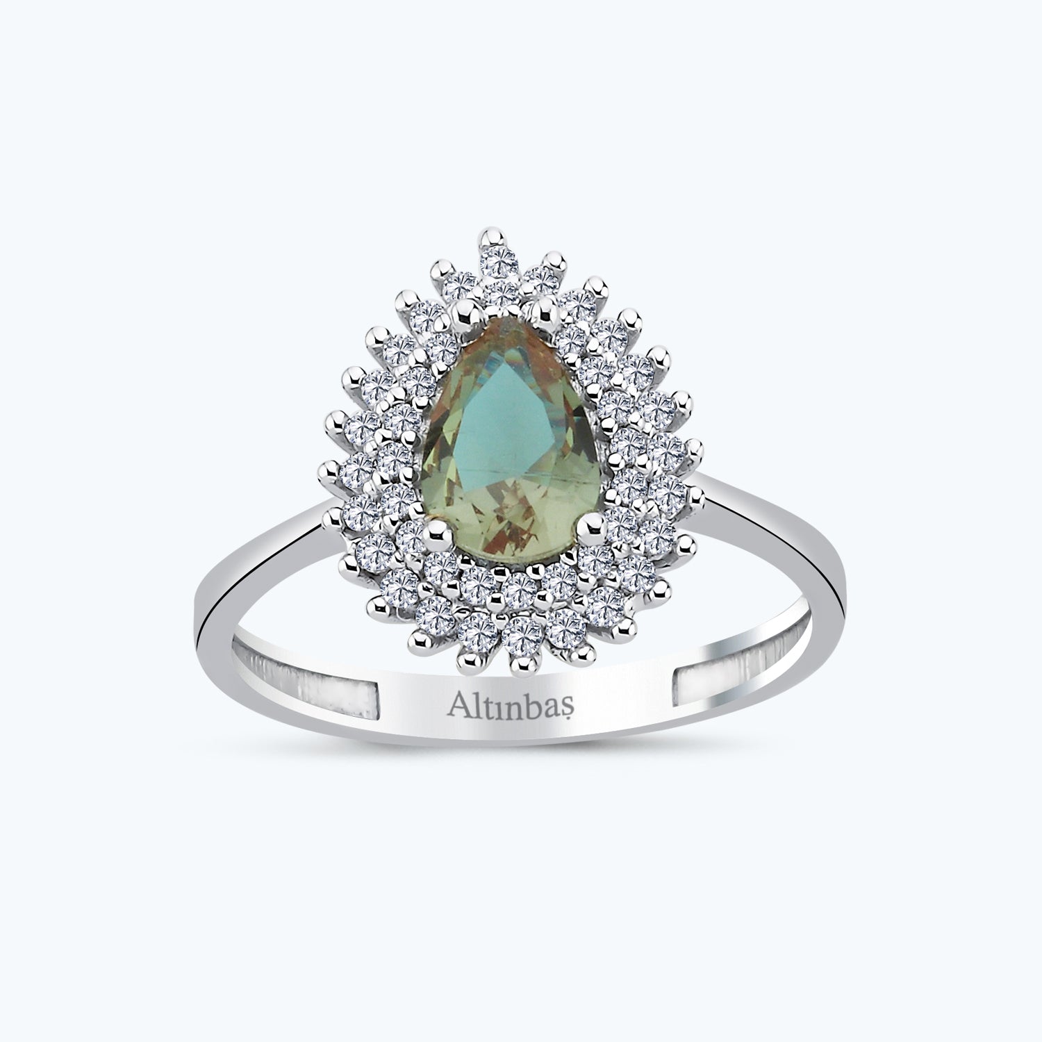 Introducing the stunning Drop Gold Ring from Altınbaş Jewellery, a symbol of passionate love and a treasure that is designed to last forever. This exquisite piece is a testament to the craftsmanship and quality that Altınbaş is renowned for, promising to elevate your everyday elegance. Crafted from 14K white gold, this ring is not just a piece of jewellery, but a work of art. The white gold setting exudes a level of sophistication and class that is unparalleled, ensuring that this ring will remain a timeless piece in your collection. At the heart of this ring lies a captivating green cubic zirconia stone. Cut in a pear shape, the stone is a vision of beauty, reflecting light in the most enchanting way. The green hue of the stone adds a touch of uniqueness and charm, making this ring a standout piece. Surrounding the central stone, the ring is adorned with cubic zirconia stones that add a touch of sparkle and glamour to the design. These stones are meticulously set to enhance the beauty of the ring, reflecting light to catch the eye and turn heads. This Drop Gold Ring is not just an engagement ring, but a token of everlasting love. It's a piece designed for women who appreciate the finer things in life, those who understand the value of timeless elegance and sophistication. The ring is more than a piece of jewellery; it's a statement, a symbol of love, and a treasure that will last forever. Whether you're looking to make a proposal unforgettable or simply want to treat yourself to a piece of luxury, this ring from Altınbaş is the perfect choice. Experience the joy of owning an Altınbaş piece and let the Drop Gold Ring become a cherished part of your jewellery collection.