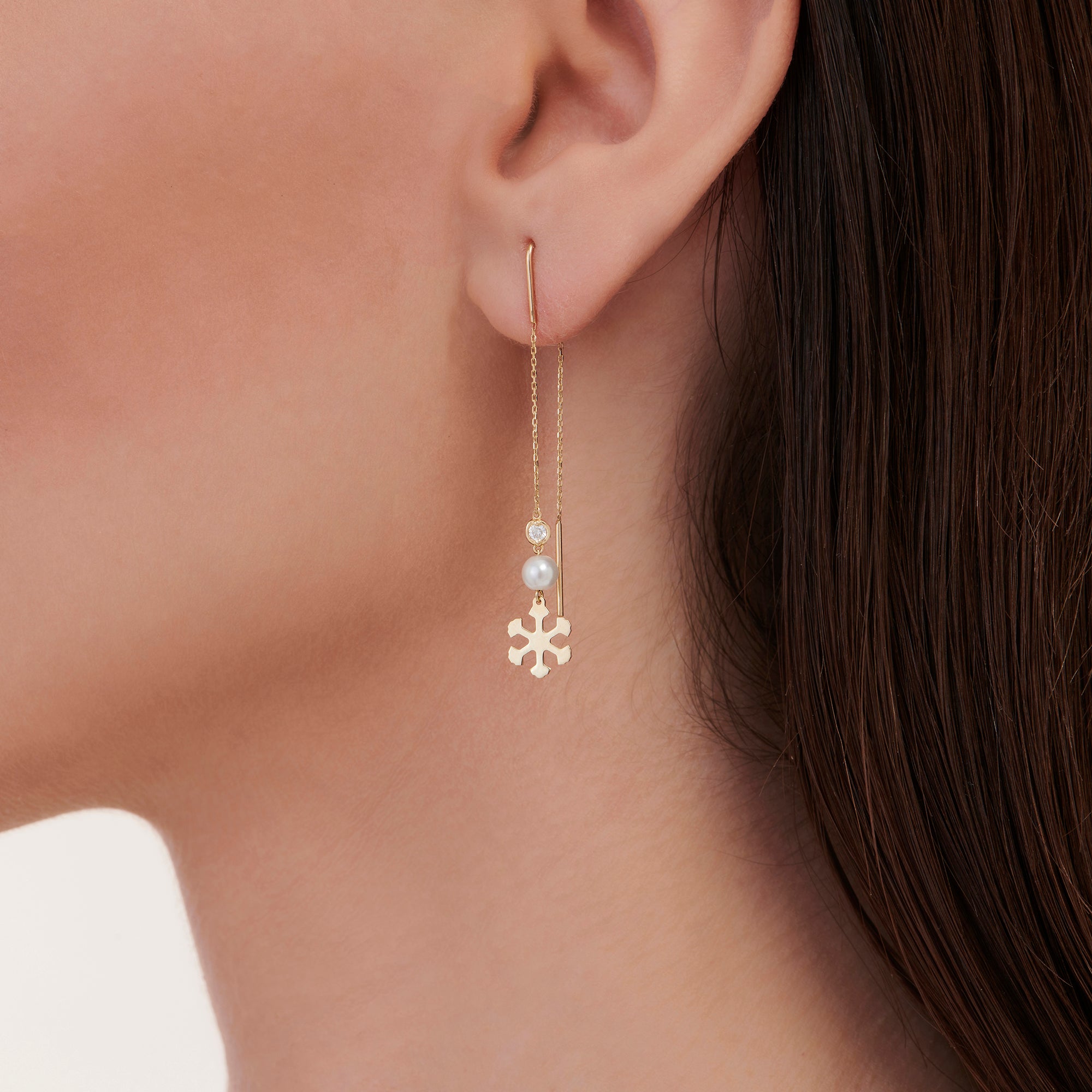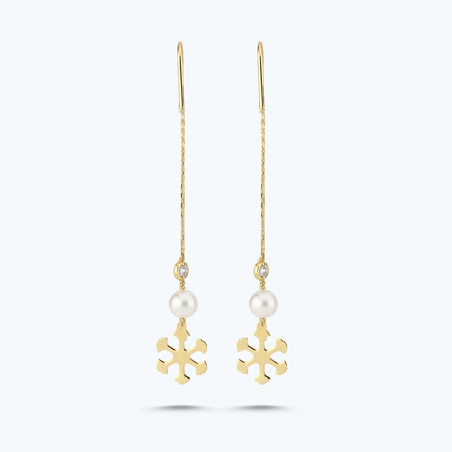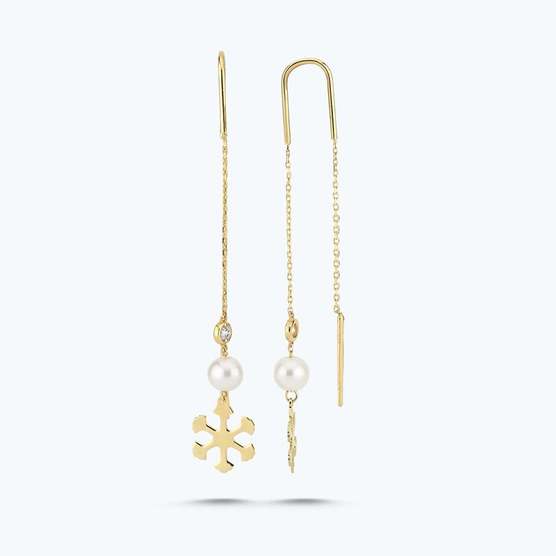 Introducing Altınbaş Jewellery's Pearl Diamond Earrings, an exquisite and timeless piece of adornment that embodies sophistication and charm. These earrings are meticulously crafted from 14K gold, featuring a polished finish that exudes an air of elegance and luxury. Each earring is adorned with a captivating green diamond, masterfully cut in a round shape to enhance its brilliance and sparkle. The green diamond, coupled with the glow of gold, creates a stunning contrast that is sure to draw the eye and garner compliments. The crowning glory of these earrings, however, is the lustrous pearl that dangles gracefully. Pearls are a symbol of timeless elegance, and these earrings are no exception. They add a touch of classic beauty to any outfit, making them a versatile addition to your jewellery collection. These earrings are not just pieces of jewellery; they are a celebration of the artistry and craftsmanship that Altınbaş Jewellery is renowned for. The intricate design and impeccable execution of these earrings are a testament to our commitment to quality and style. Whether you're dressing up for a special occasion or simply want to add a touch of sophistication to your everyday look, these Pearl Diamond Earrings are the perfect choice. They are a shining example of the elegance and charm that Altınbaş Jewellery embodies, making them a must-have for any jewellery aficionado. Experience the luxury and sophistication of Altınbaş Jewellery with these stunning Pearl Diamond Earrings. They are more than just an accessory; they are a statement of style and elegance that will never go out of fashion.