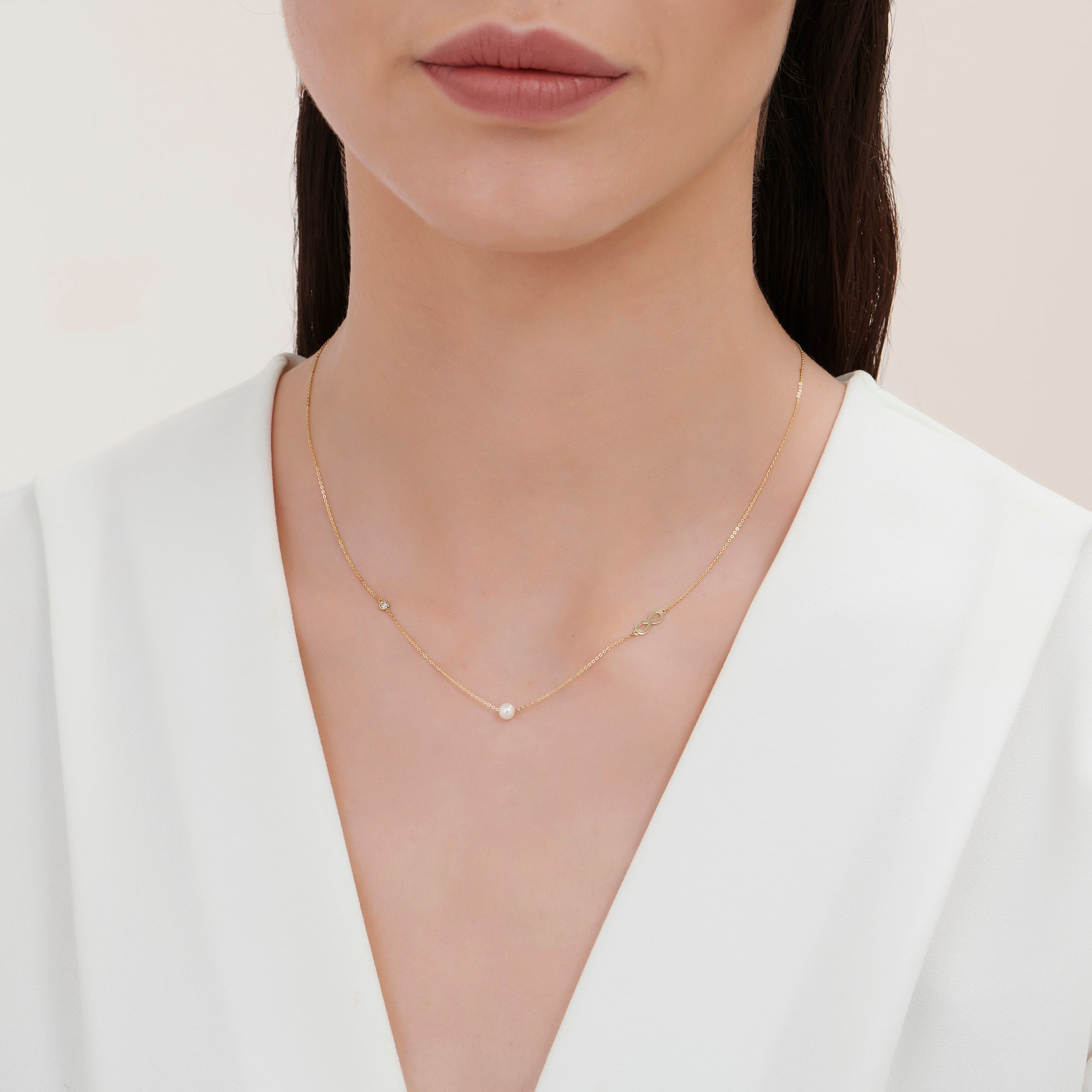 With a dainty design, the Altınbaş Jewellery Infinity Pearl Diamond Necklace is carefully handcrafted from 14ct Solid Gold with the most sparkling pure diamond selected and carefully set by experienced craftsmen.