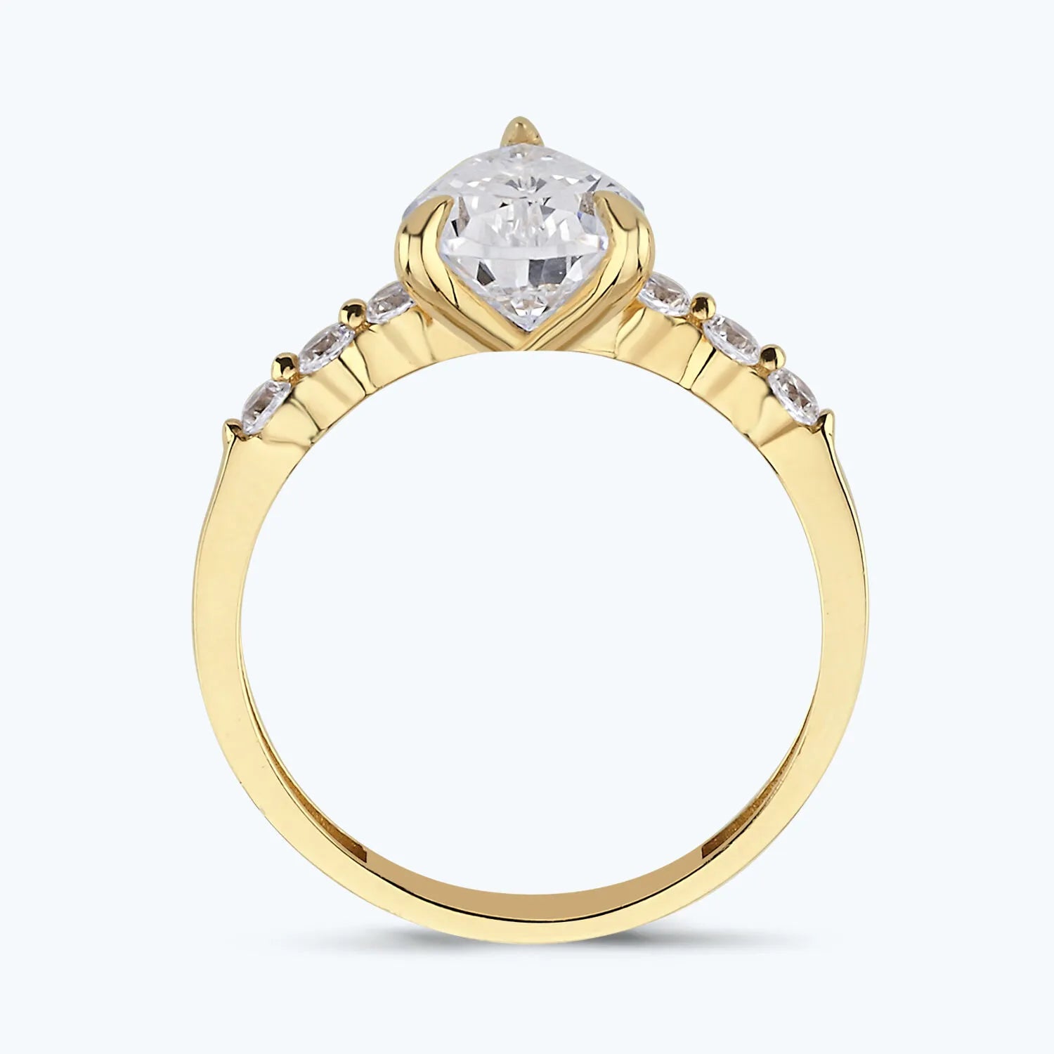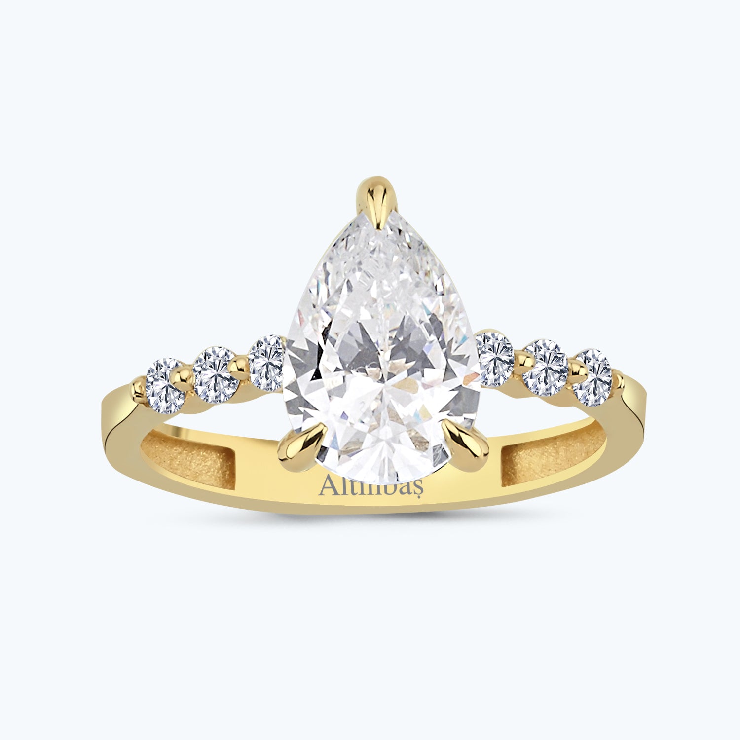Presenting the exquisite Drop Gold Ring from Altınbaş Jewellery, a piece that effortlessly embodies sophistication and quality. Crafted with meticulous attention to detail, this ring is a true testament to the epitome of refined taste. Fashioned from 14K yellow gold, the ring exudes a warm and radiant glow that is both timeless and elegant. The gold is not merely a material, but a symbol of prestige and value that has been cherished throughout history. By choosing this ring, you are not just purchasing a piece of jewellery, but a mark of honour and respect. The ring features a white cubic zirconia stone, cut in a captivating pear shape. This stone, renowned for its brilliance and clarity, adds an irresistible sparkle that is sure to turn heads. The pear cut enhances the stone's natural beauty, creating a dazzling display of light and colour. This Drop Gold Ring is not just a piece of jewellery, but an expression of passionate love. It makes a perfect gift for anniversaries or engagements, symbolising a promise of eternal love and commitment. With every glance at this ring, your loved one will be reminded of the special bond you share. Altınbaş Jewellery understands the importance of every moment and emotion. This ring is designed with the modern woman in mind, one who appreciates the blend of tradition and contemporary design. It's more than just a ring - it's a statement, a promise, and a testament to love and respect. Choose the Drop Gold Ring from Altınbaş and let its beauty and elegance speak volumes about your taste and affection.