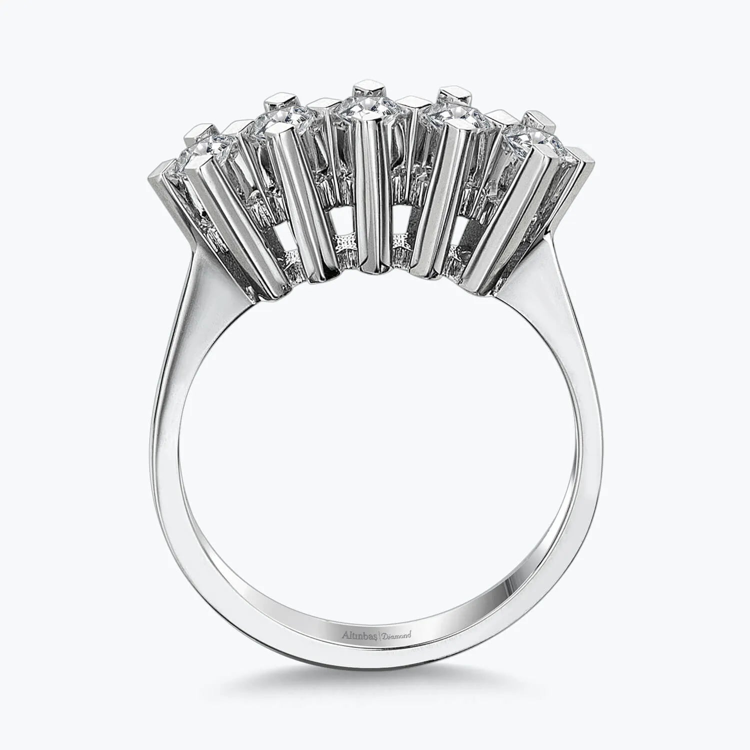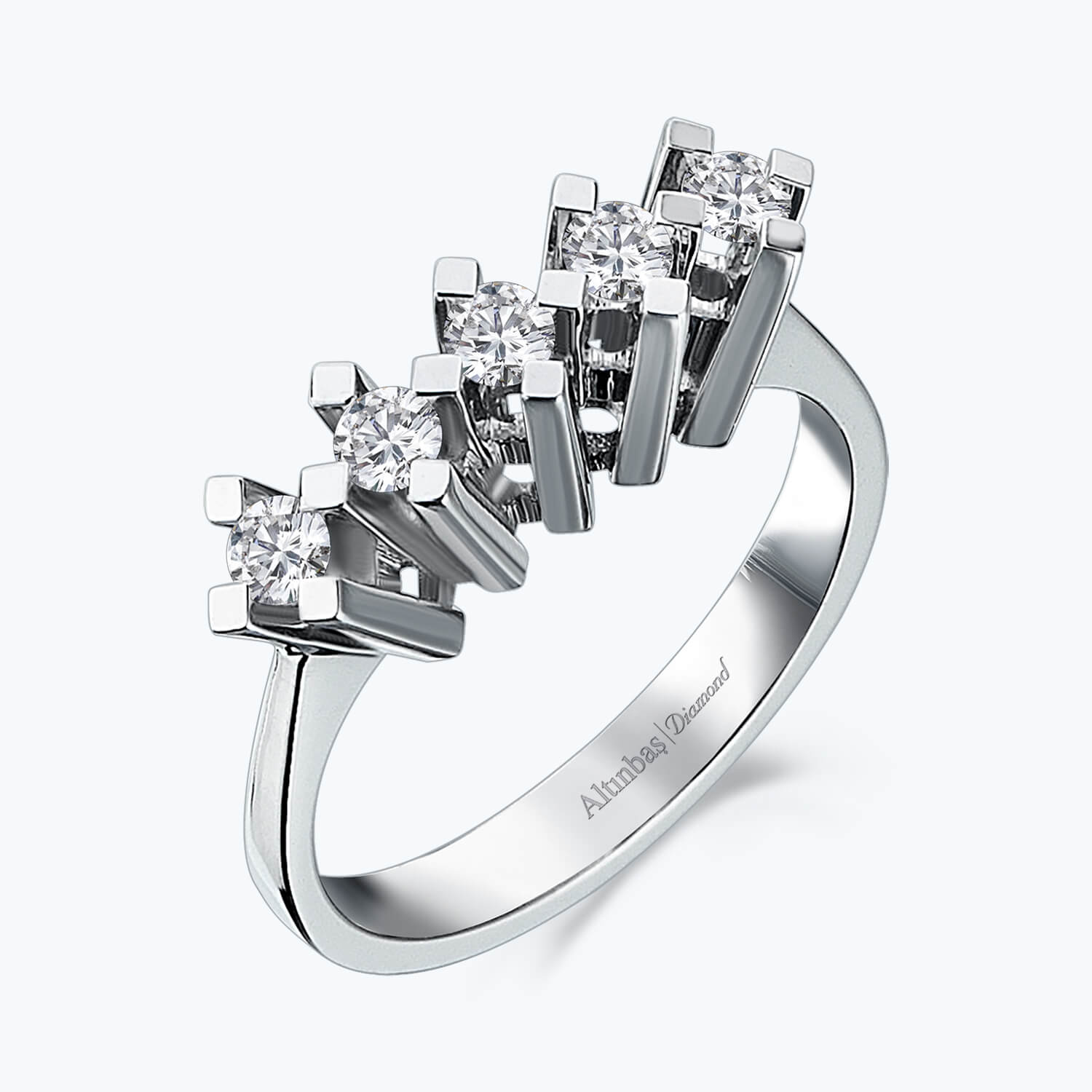Introducing Altınbaş's Five Stone Diamond Ring, a luxurious embodiment of pure sophistication and quality. Crafted from 14K white gold, this stunning piece is more than just a ring. It's an unbroken continuity of style, a symbol of infinite love and an unfading emblem of divine and royal power. This ring is meticulously designed with five dazzling round diamonds, each one carefully selected and set to create a breathtaking display. The diamonds are of G and H colour, reflecting the purest light, and SI clarity, ensuring a clear and brilliant sparkle that captures the heart. This combination of diamonds and gold creates a ring that is not just a piece of jewellery, but a work of art. Perfect for women who appreciate the finer things in life, this ring is an ideal choice for an engagement ring. The five stones represent a journey of love that is as infinite as the circle of the ring itself. Each stone is a testament to every milestone and moment shared, making this ring a beautiful symbol of your unique love story. Altınbaş's Five Stone Diamond Ring is more than just an accessory. It is a statement piece, embodying pure luxury and sophistication. It is a testament to the craftsmanship and quality that Altınbaş is known for, making it a perfect choice for those who seek to express their love in the most elegant and meaningful way. Wear it with pride, knowing that it is a symbol of a love that is as enduring and precious as the diamonds it holds.