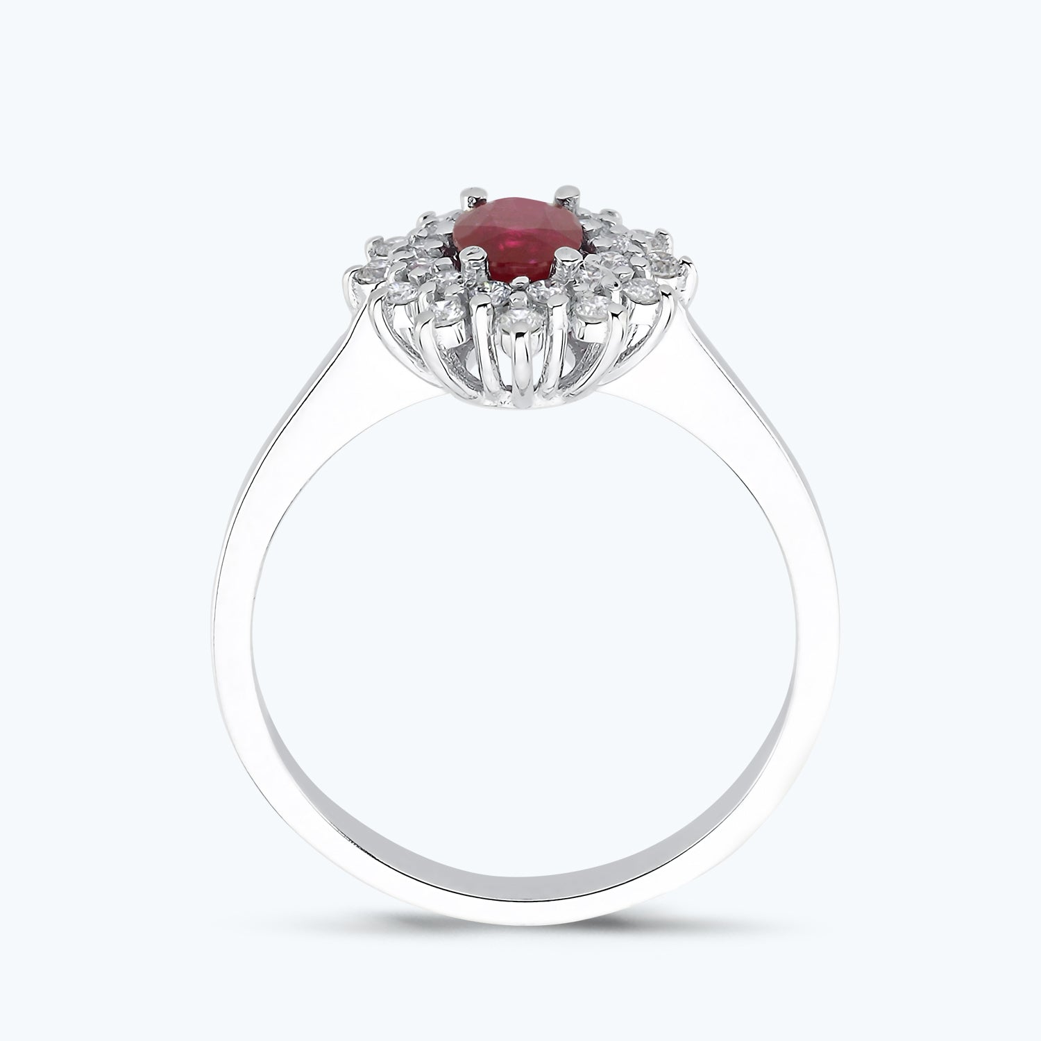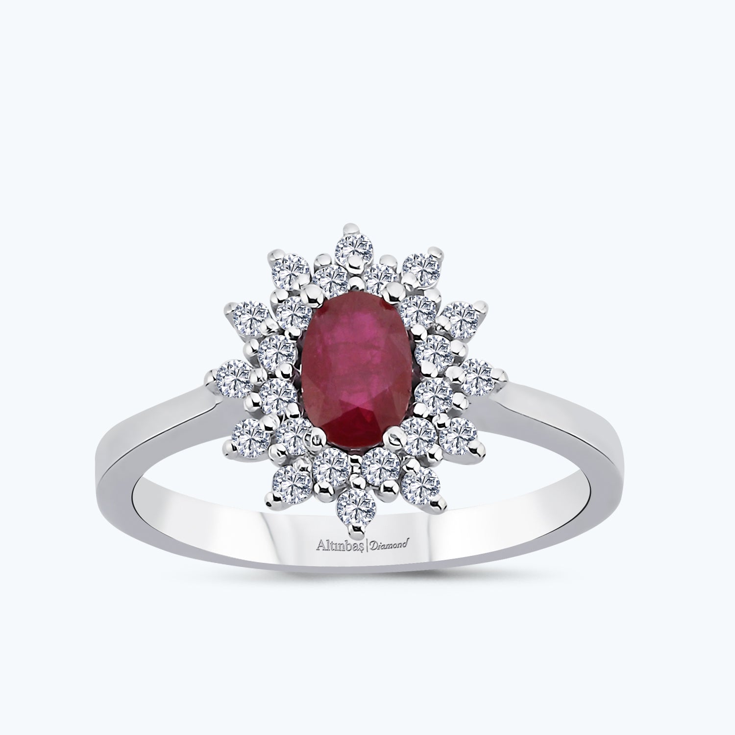 Introducing the Ruby Diamond Ring, a true embodiment of Altınbaş Jewellery's commitment to sophistication and quality. This magnificent piece is designed to tell a unique love story, one that is as bright and attractive as the ring itself. The ring boasts an exquisite white hue, a testament to its exceptional craftsmanship and high-quality materials. The centrepiece of the ring is a stunning oval gemstone, carefully selected for its vibrant colour and sparkle. This gemstone is a homage to a touch of classic charm, beautifully blending tradition with contemporary style. The stone is set in an intricate design, reflecting the modern woman's desire for uniqueness and individuality. This ring is more than just a piece of jewellery; it's an expression of love and commitment. The diamonds that adorn this ring are not merely accents; they are symbols of an enduring bond. They catch the light in a mesmerising dance, adding a touch of glamour and elegance to any outfit. As an engagement ring, this piece speaks volumes. It tells a story of love that is as unique as the woman wearing it. It's a promise of a future filled with joy and happiness, a symbol of a bond that will stand the test of time. With the Ruby Diamond Ring from Altınbaş Jewellery, you're not just giving a gift; you're telling a story. This ring is a masterpiece that will be treasured for a lifetime, a beautiful reminder of a love that is as timeless as the diamonds it holds. Step into the world of Altınbaş Jewellery, where every piece tells a story. Make the Ruby Diamond Ring part of your love story today.