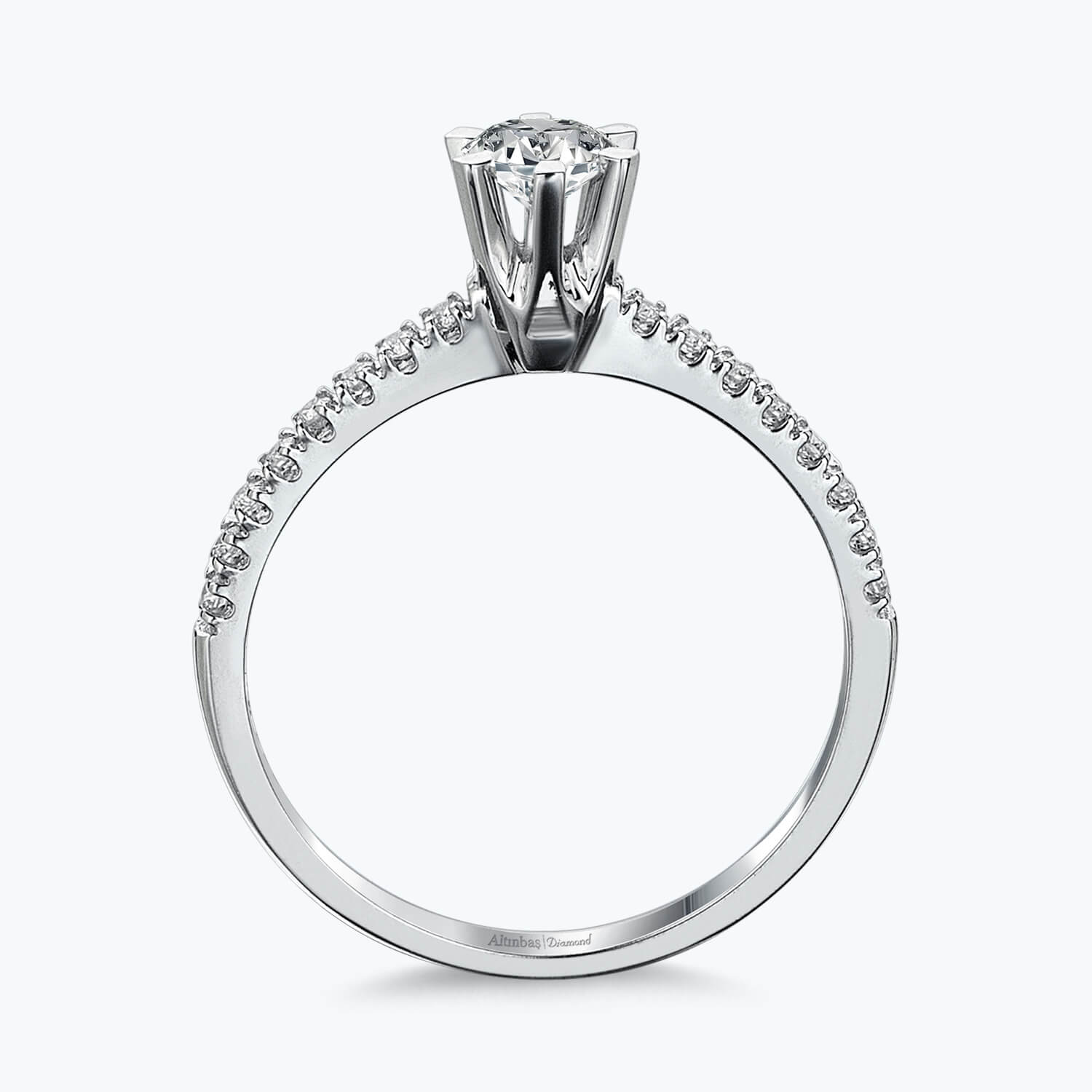 Introducing the Solitaire Diamond Ring, a stunning masterpiece from Altınbaş Jewellery. This unique piece is more than just a ring; it is a symbol of sincerity in commitment, an emblem of timeless elegance, and a manifestation of wealth and prestige. Expertly crafted to perfection, it is designed to be a showstopper at every event, capturing the essence of luxury and sophistication. The ring is beautifully sculpted from 14K white gold, a metal renowned for its lustrous sheen and durability. The use of white gold not only enhances the overall aesthetic but also unveils the beauty of gold in a contemporary light. Its brilliance is further amplified by the presence of a solitaire round diamond, meticulously set to radiate a captivating sparkle. The Solitaire Diamond Ring is not just a piece of jewellery; it is an endless circle of fashion. Its design is timeless, ensuring that it remains a stylish accessory for years to come. The round diamond, synonymous with eternal love, is a testament to the enduring allure of this ring. In addition to the solitaire diamond, the ring is adorned with side stones, enhancing its visual appeal. Each diamond is carefully selected, adhering to our strict quality standards, ensuring that every piece we create is a testament to our commitment to excellence. Designed for women who appreciate the finer things in life, this ring is an exquisite addition to any jewellery collection. It's not just an engagement ring; it's an expression of love, a symbol of commitment, and a statement of style. At Altınbaş Jewellery, we believe in creating pieces that are not only beautiful but also meaningful. Our Solitaire Diamond Ring is not just a product; it's a piece of art that tells a story of love, commitment, and style. It's a ring that speaks volumes about the woman who wears it. It's a ring that defines her. Choose the Solitaire Diamond Ring from Altınbaş Jewellery, and let your style speak for itself.