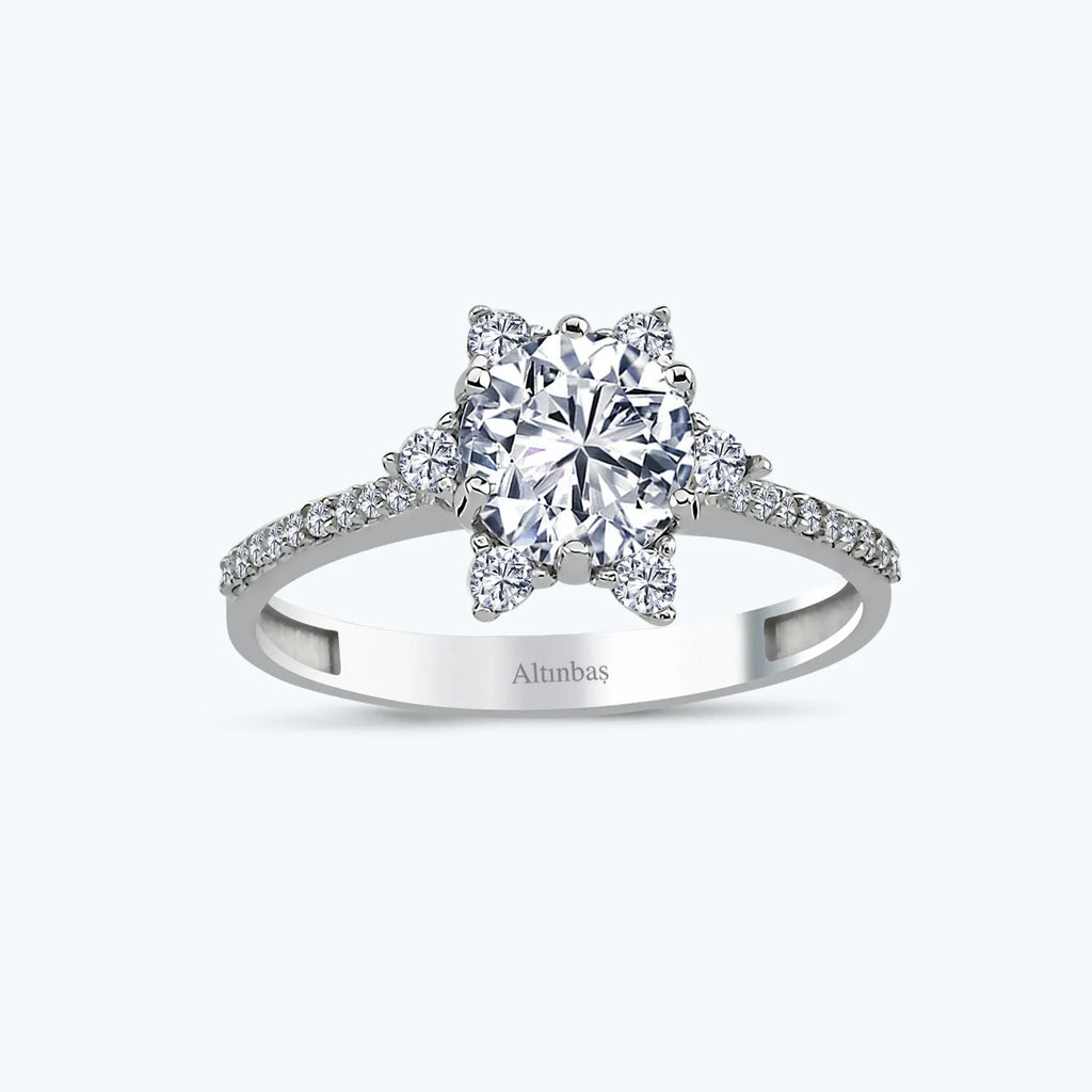 Introducing the Solitaire Gold Ring from Altınbaş Jewellery, a masterpiece that embodies the infinite cycle of beauty. This exquisite ring is meticulously crafted from 14K white gold, a testament to the strength and resilience that marks every piece from our collection. The gleaming white gold is not just a symbol of purity and luxury, but also a testament to the enduring quality that Altınbaş Jewellery is renowned for. This ring features a solitaire round cubic zirconia, elegantly set to catch the light from every angle. The cubic zirconia, with its flawless sparkle, is a testament to the beauty that can be found in simplicity, making this ring a perfect choice for the modern woman who appreciates understated elegance. The intricate design of this ring is a perfect blend of traditional craftsmanship and contemporary aesthetics. It is a reflection of the modern woman's desire for unique and sophisticated jewellery pieces that stand out, yet seamlessly blend with her everyday style. The Solitaire Gold Ring is not just a piece of jewellery; it is a statement of style, a symbol of strength and resilience, and a tribute to the infinite cycle of beauty. It is a piece that will add a touch of sophistication to any outfit, making it a must-have addition to your jewellery collection. Whether you are treating yourself or gifting someone special, this Solitaire Gold Ring from Altınbaş Jewellery is a choice that speaks volumes about your taste and appreciation for quality and elegance.